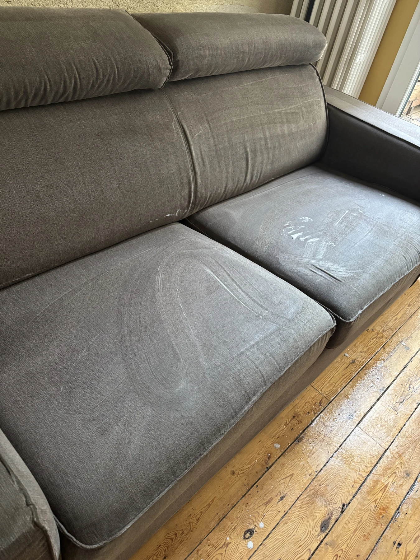 Ce canapé présentait des reflets jaunâtres sur certaines zones, dus à l’usure et à l’accumulation de salissures. Un nettoyage en profondeur s’imposait pour lui redonner sa teinte d’origine et raviver les fibres du tissu. Résultat : un canapé propre, sain et comme neuf, sans altération des couleurs.