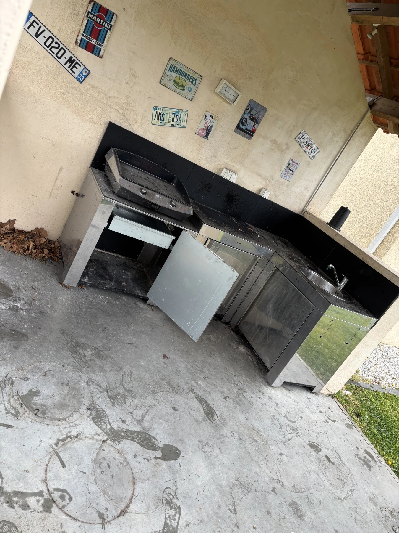 Nettoyage complet d’une cuisine extérieure en inox restée à l’abandon pendant un an : décapage des graisses séchées, suppression des auréoles, traitement de surface pour raviver l’inox piqué, nettoyage des placards intérieurs et contours. Après une journée de travail, cette cuisine de grande qualité a retrouvé tout son éclat d’origine.