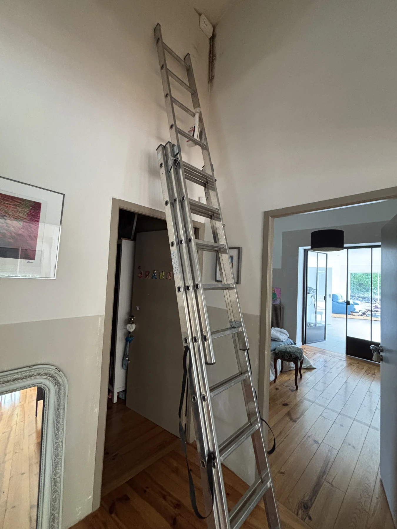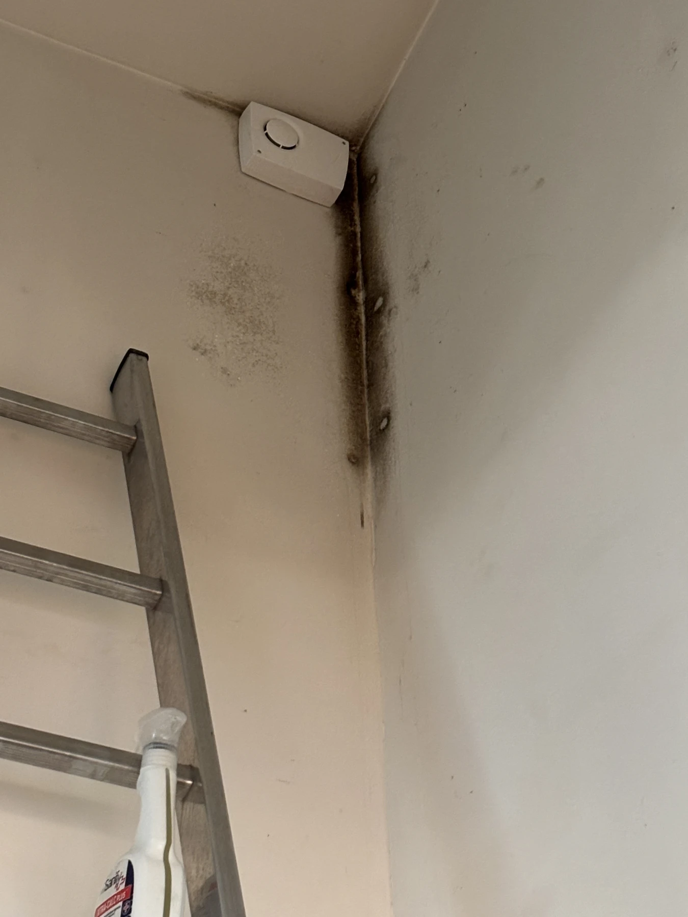 Suite à une infiltration d’eau, ce plafond présentait une large traînée de moisissure particulièrement visible, alors même que le reste du mur était en parfait état. Avant toute intervention, nous avons procédé à un examen approfondi afin de déterminer l’origine et la profondeur de l’humidité.