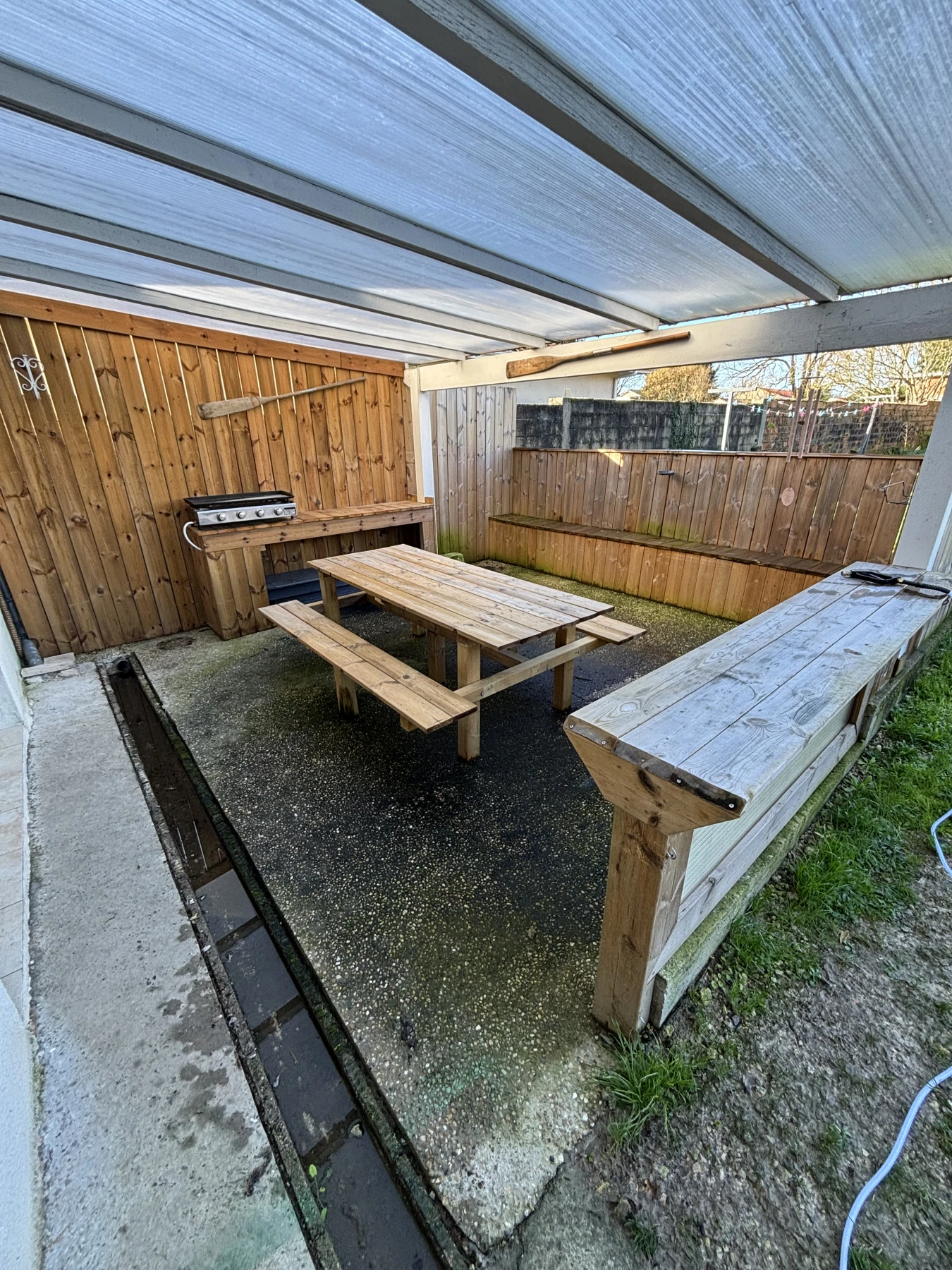 Après plusieurs mois – voire années – sans entretien, cette terrasse avait perdu tout son éclat. Entre les salissures incrustées, les mousses, le noircissement du bois et le béton terni par le temps, un simple nettoyage classique ne suffisait plus.