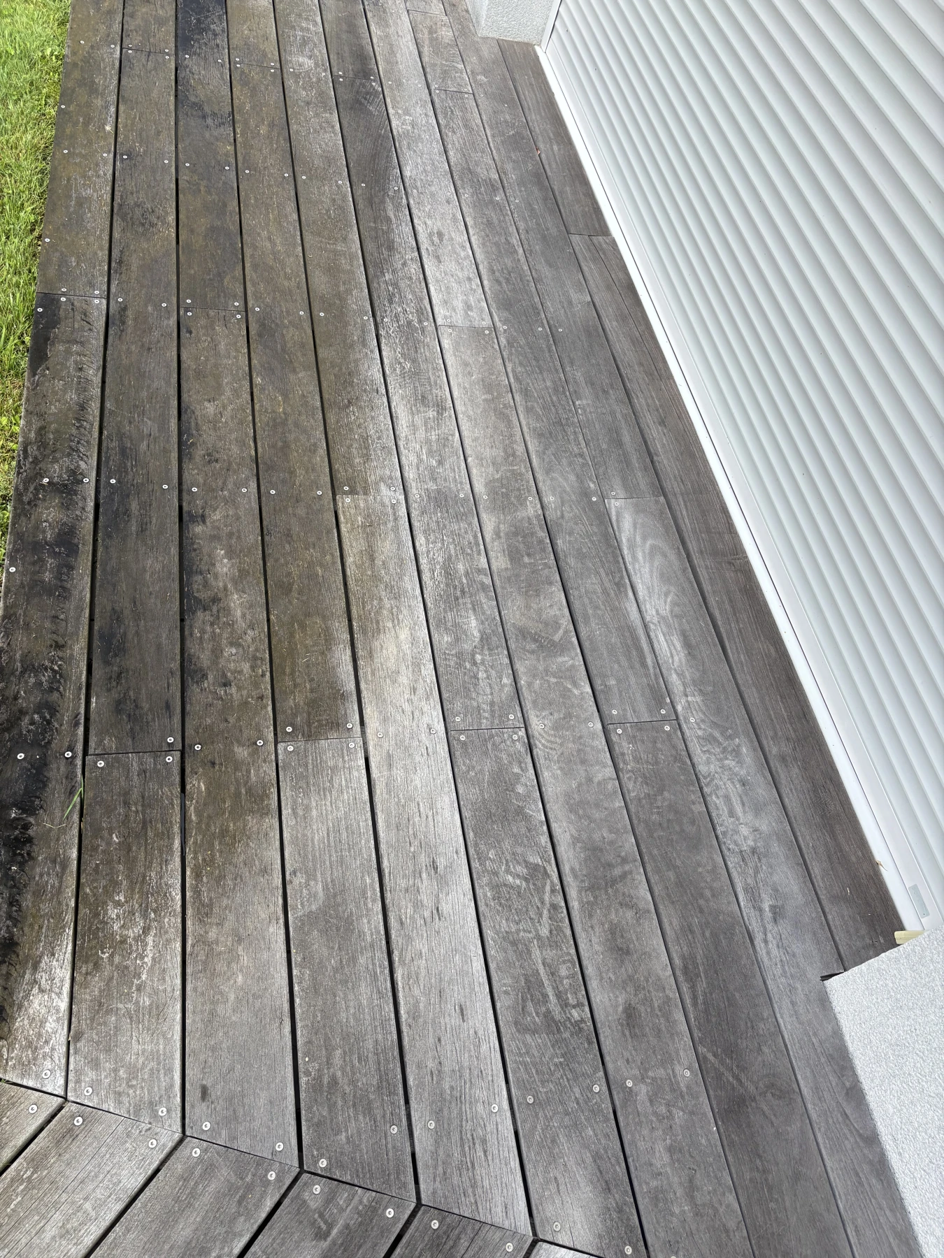 Nous sommes intervenus sur la commune de Saint-Aubin-du-Médoc pour un nettoyage complet d’une terrasse en bois exotique de type Ipé, reconnue comme l’une des meilleures essences pour l’extérieur. Comme vous pouvez le constater sur les photos, cette terrasse n’avait pas été entretenue depuis plus de dix ans et avait perdu tout son éclat, laissant apparaître une teinte grisâtre caractéristique.