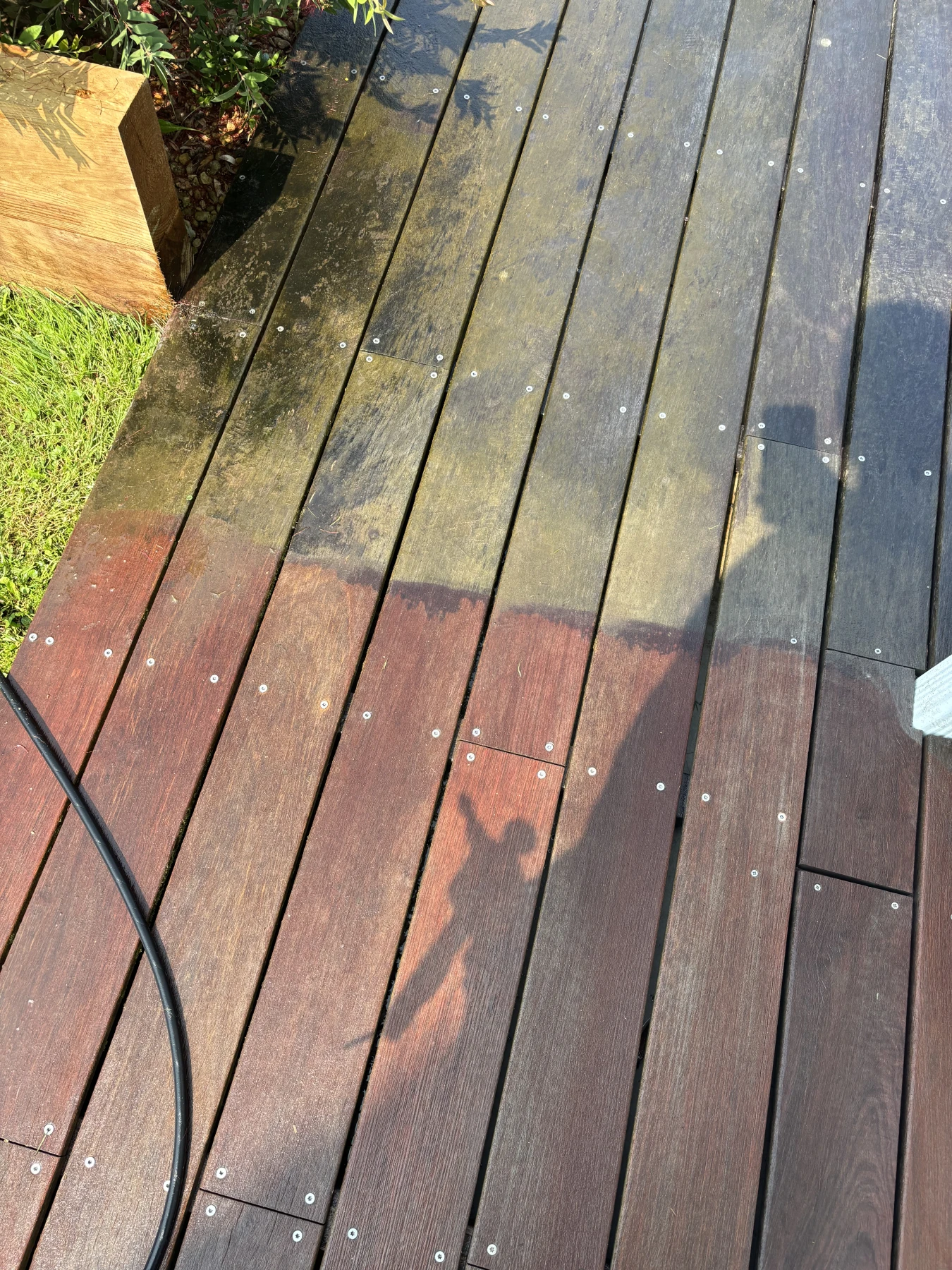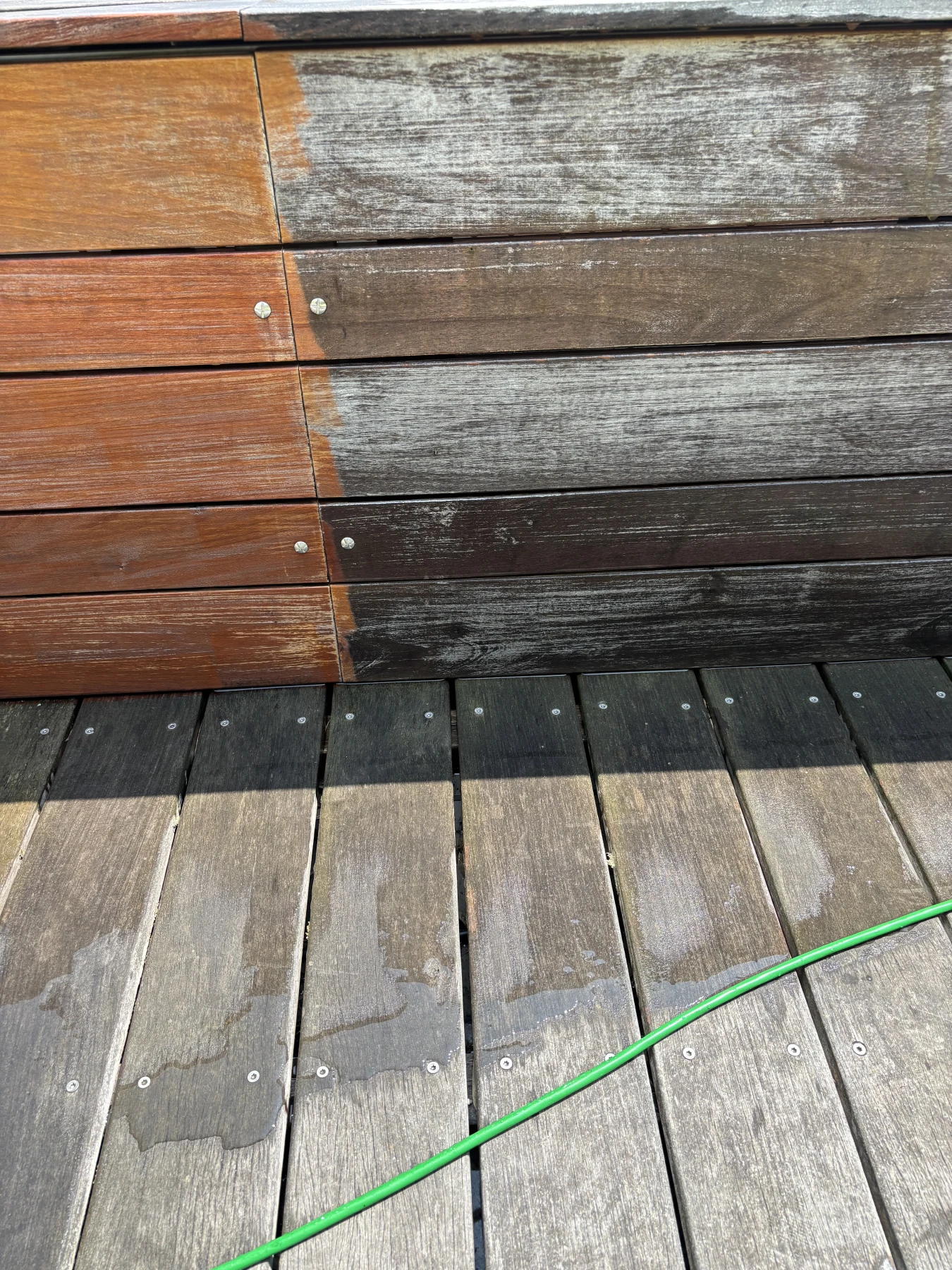 Dans un premier temps, nous avons procédé à un nettoyage soigneux avec un matériel adapté, afin de ne pas abîmer le bois ni l’écailler. Ce travail a permis de dégraisser la surface et de retirer les dépôts accumulés au fil des années. Ensuite, un dégriseur spécifique a été appliqué, redonnant à l’Ipé sa couleur naturelle et mettant en valeur le veinage du bois.