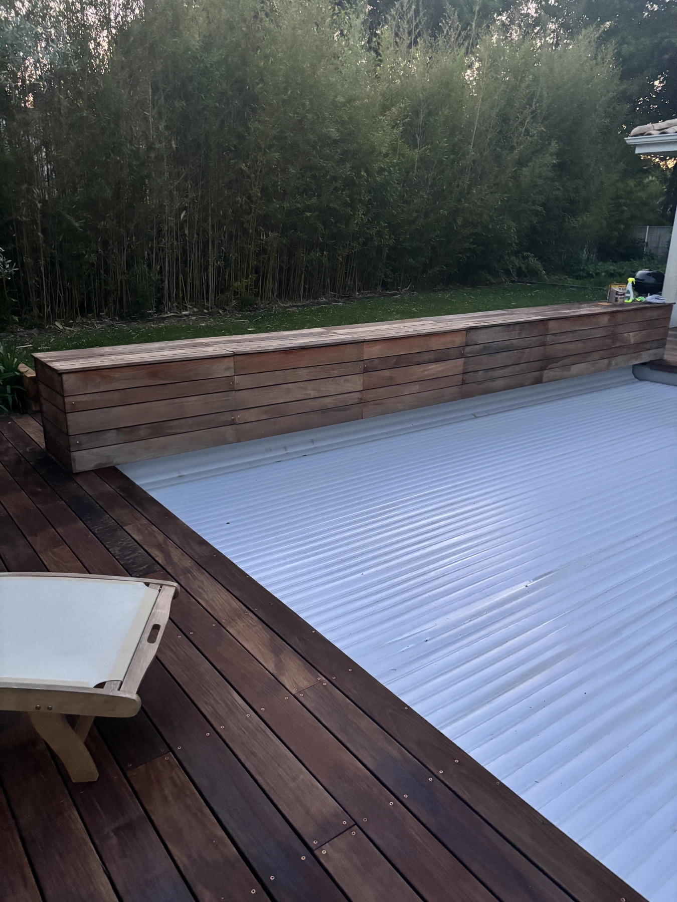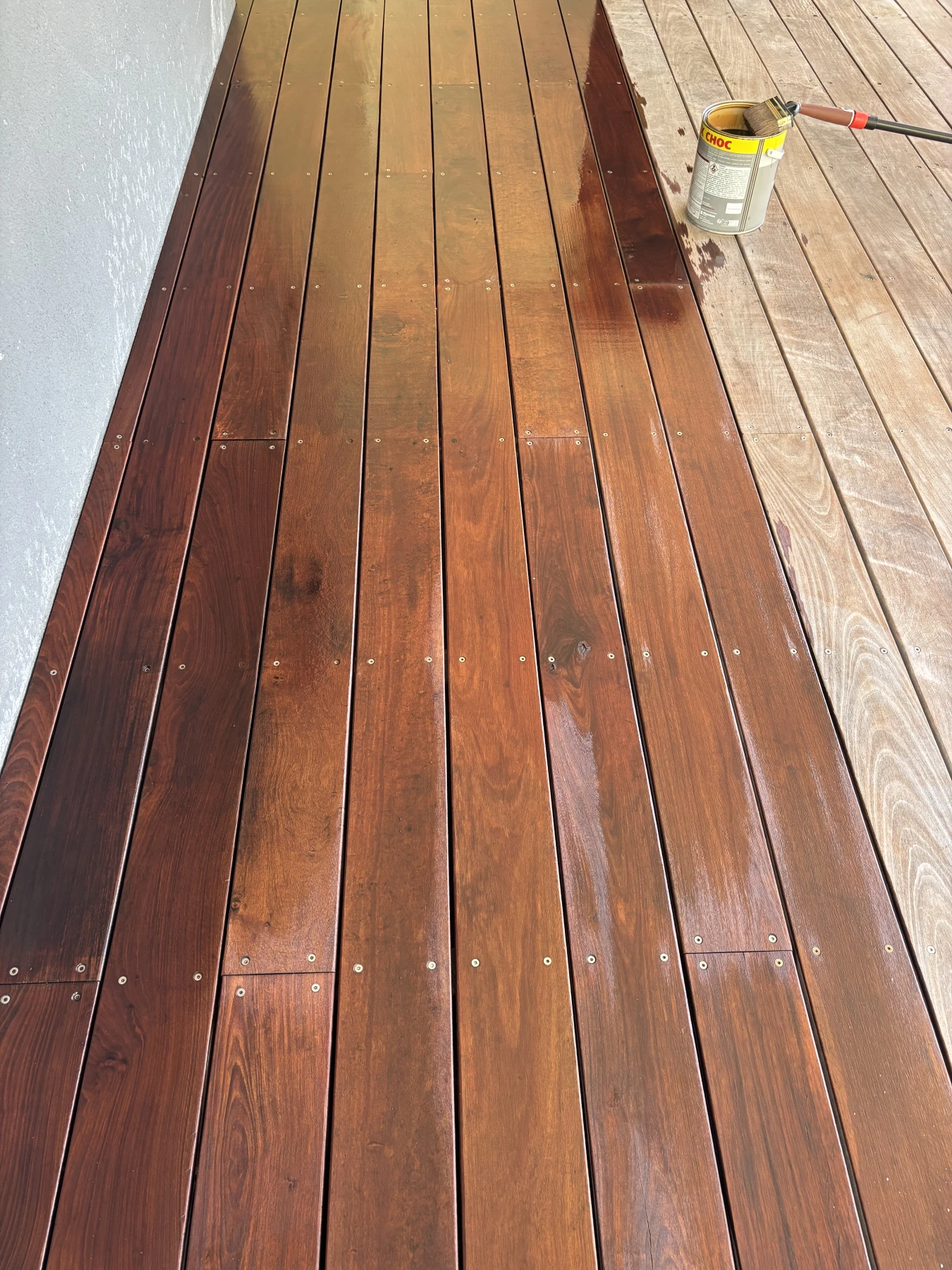 Après un temps de séchage complet et maîtrisé, nous sommes revenus quelques jours plus tard pour appliquer une couche de saturateur spécialement conçu pour le bois exotique. Ce traitement a nourri le bois en profondeur, lui offrant à la fois une protection durable contre les agressions extérieures et un aspect esthétique remarquable.